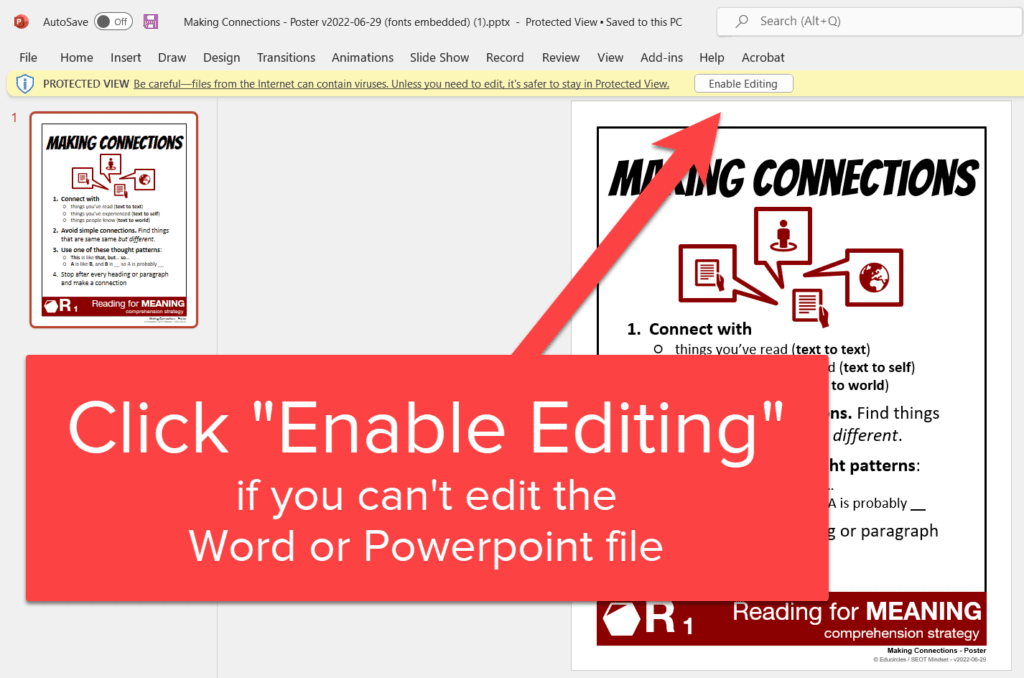 When you download a file from the internet, Microsoft Powerpoint and Word will open the file in PROTECTED VIEW.